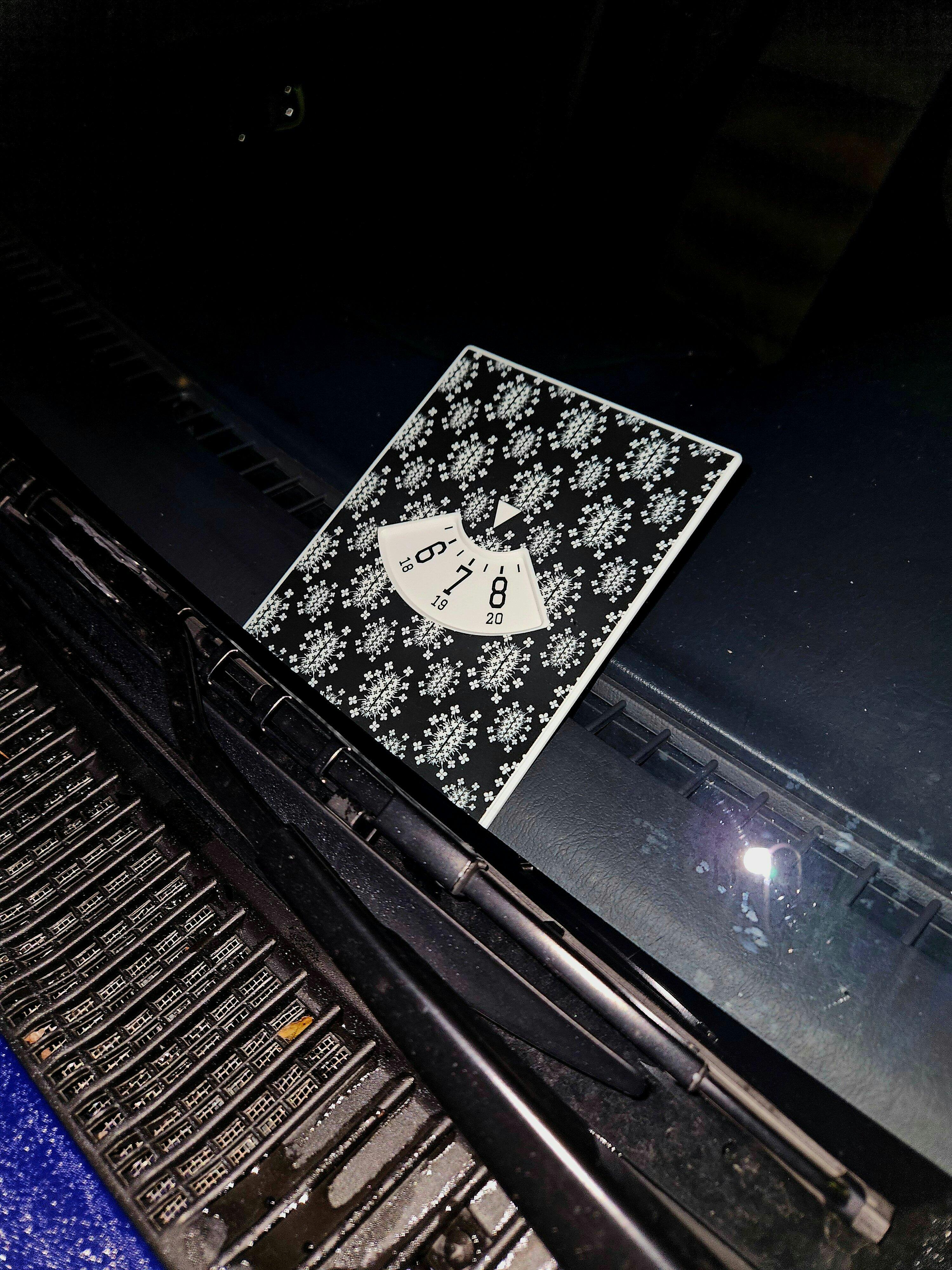 Pysäköintikiekko Terhi Laitakarin suunnittelemalla Tuhero kuvion Puskapalovaara kuosilla varustettuna.